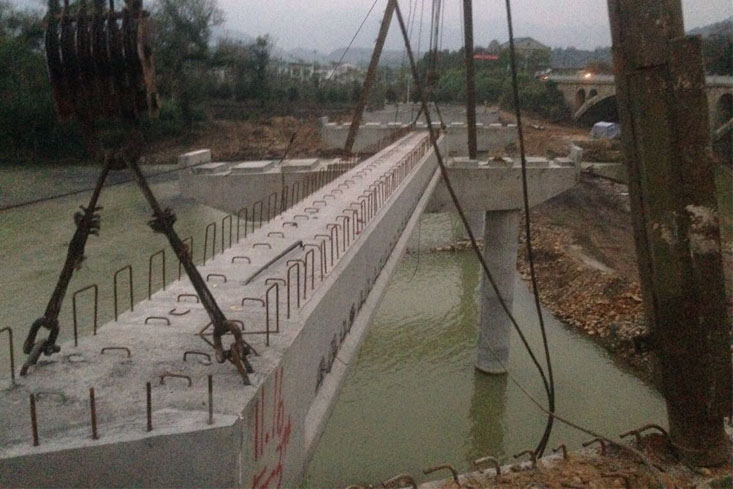 下午16時30分,公司下屬機(jī)械分公司副經(jīng)理朱超群、該項(xiàng)目部經(jīng)理汪承亮下達(dá)開始架梁的命令?,F(xiàn)場頓時掌聲雷動,禮花飛舞。在雙滑輪組的勻速滑輪中,空心板梁被緩緩?fù)扑偷轿?,徐徐降落固定,?jīng)過近40分鐘的精心操作,S347炎陵石潮至壟下公路新河漠大橋4#-5#墩5-3#空心板中梁順利架設(shè)成功。